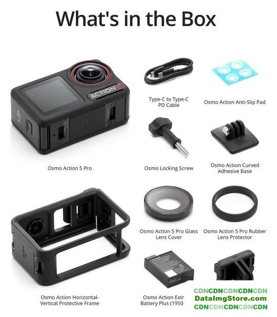 | Комплект поставки | - Osmo Action 5 Pro- 3 аккумулятора Osmo Action Extreme Plus (1950 мАч)- DJI Multifunctional Battery Case- Монопод Osmo 1.5м- Горизонтально-вертикальная защитная рамка- Быстросъемный адаптер Osmo Action- Изогнутая клеевая основа Osmo Action- Стопорный винт Osmo- Кабель PD Type-C-Type-C- Резиновая защита линз Osmo Action 5 Pro- Стеклянная крышка объектива Osmo Action 5 Pro- Противоскользящая накладка Osmo Action- Наклейка с логотипом DJI |