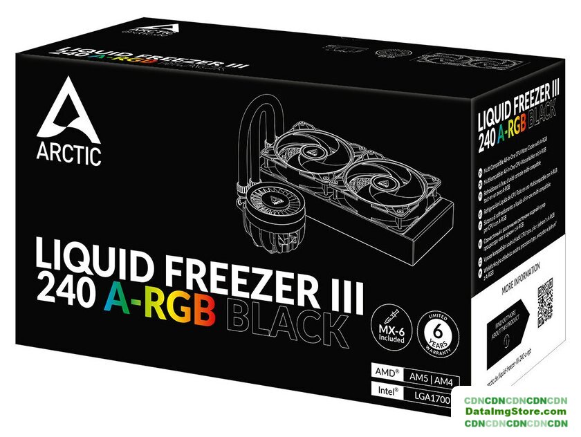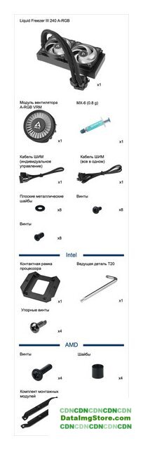 | Комплектация | 1x Liquid Freezer III 240 A-RGB1x Модуль вентилятора VRM1x MX-6 (0.8 g)1x Кабель ШИМ (индивидуальное управление) 1x Кабель ШИМ (все в одном) 8x Плоские металлические шайбы16x ВинтыIntel1x Контактная рамка процессора 1x Ведущая деталь T204x Упорные винтыAMD4x Винты4x Шайбы1x Комплект монтажных модулей |