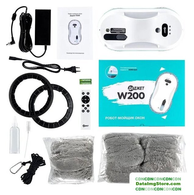 | Комплектация | Робот-мойщик окон dBot W200Руководство пользователяБлок питания с кабелемПульт управленияЕмкость для моющего средстваБатарейки для пульта управления (2 шт)Комплект салфеток (20 шт)Дополнительные кольца для салфеток (2 шт)Страховочный трос с карабином |